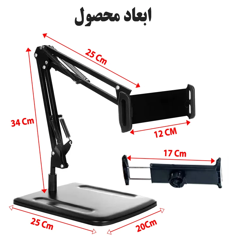 نوع پایه نگهدارنده گوشی و تبلت مناسب برای استفاده روی میزمناسب برای عکاسی سلفی ابعادمیلیمترمناسب برای تلفن همراه با طول ۱۲ تا ۱۷ سانتیمتر / تبلت با عرض بین ۱۲ تا ۱۷ سانتیمترجنس فلزی و پلاستیک ABSقابلیتهای دستگاه امکان چرخش ۳۶۰ درجه قابلیت تنظیم ارتفاع