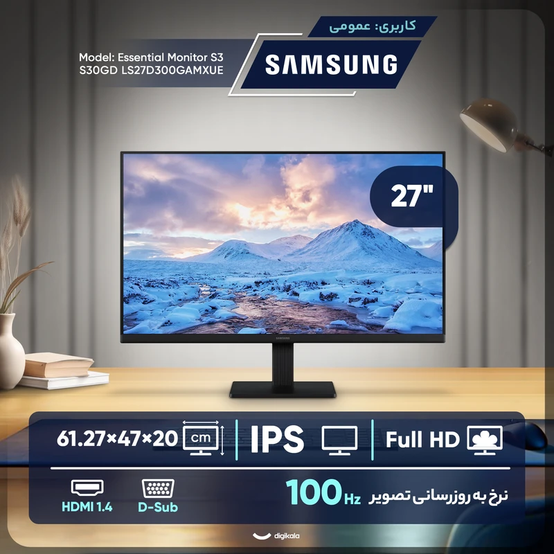 مانیتور ۲۷ اینچ سامسونگ مدل Essential Monitor S3 S30GD LS27D300GAMXUE یکی از نمایشگرهای خوشساخت و کاربردی این برند است که بیشتر برای کاربری عمومی و روزمره طراحی شده. ابعاد بزرگ ۲۷ اینچی در کنار رزولوشن Full HD فضای خوبی برای تماشای فیلم، وبگردی و کار با نرمافزارهای اداری فراهم میکند. استفاده از پنل IPS باعث شده زاویه دید گسترده ۱۷۸ درجهای داشته باشد، به همین دلیل تصویر از هر طرف شفاف و بدون تغییر رنگ نمایش داده میشود. این مانیتور نرخ نوسازی ۱۰۰ هرتز دارد که نسبت به مدلهای رایج ۶۰ هرتز روانتر عمل میکند. بنابراین چه در مرور صفحات و چه هنگام تماشای ویدئو یا بازیهای سبک، حرکتها نرمتر و چشمنوازتر به نظر میرسند
